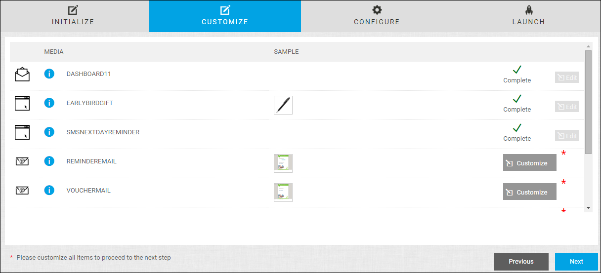 After you initialize a CMM campaign, you customize the media elements that make up the campaign. The Customize page lists all the media elements in the campaign. Here you must personalize all the media elements that have a Customize button before you can continue with the order process. Some media elements do not require customizing; these are automatically shown as Complete (and cannot be edited).