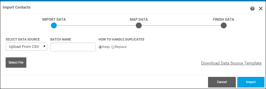 - If you plan to import contacts from a CSVĀ file and are not sure what kind of data you must supply, click Download Source Template. A file named DSMxContactUpload.csv is saved in your Downloads folder. You can use this file as the basis for your own CSV file.