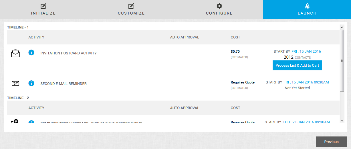 - As the campaign progresses, you are notified when it is time to start the next activity. Start the activity on the Launch page by adding the activity to the cart and paying for it. (Auto approved activities start automatically.)