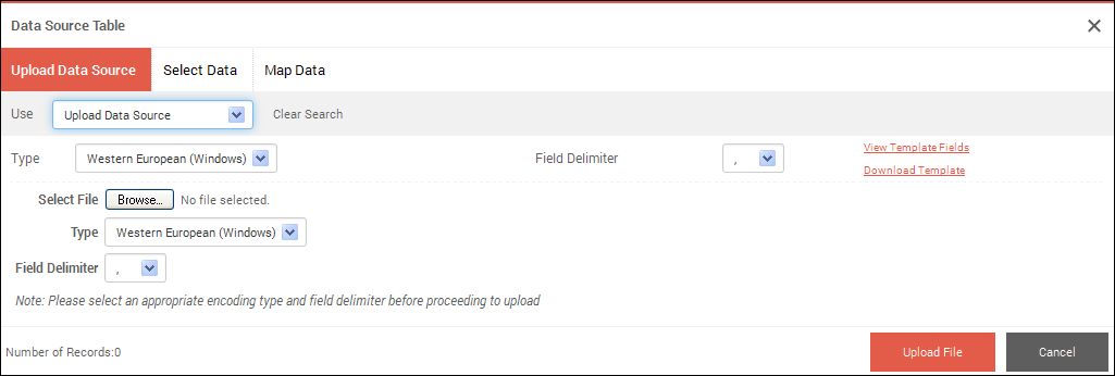 - To the right of Select File, click Browse to locate your file, make sure the Type and Field Delimiter are correct, and click Upload File.