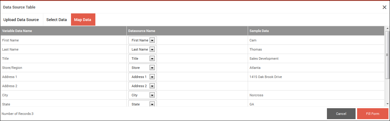 - Make sure each Variable Data Name is mapped correctly to the Datasource Name. The information in the Sample Data column comes from the file you uploaded or the data source you selected.