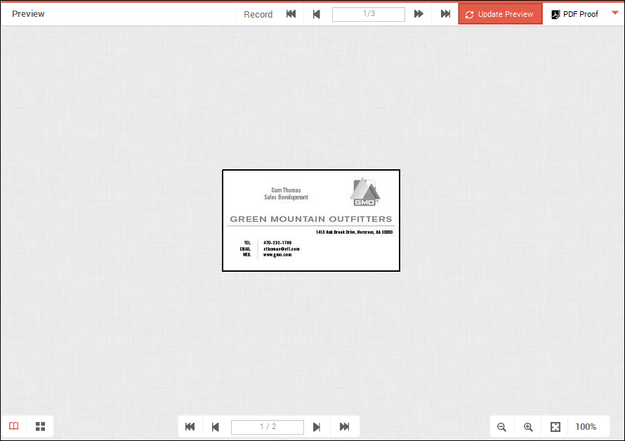 - Click Update Preview. You must preview the product before you can add it to the cart. The Preview pane opens so you can review the product. If you selected print options, the preview will reflect them.