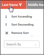 - To search for a record, move the pointer over the heading of the column where you want to search (for example, Last Name) and enter what you want to find (for example, Smith) in the Search by field. To remove the search results and restore the full list, click Clear Search.