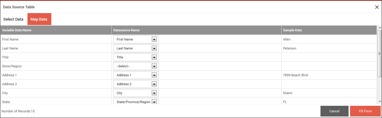 - When you are satisfied with the mapping, click Fill Form. The data you selected from the data source is now displayed in the form, where further changes can be made if required.