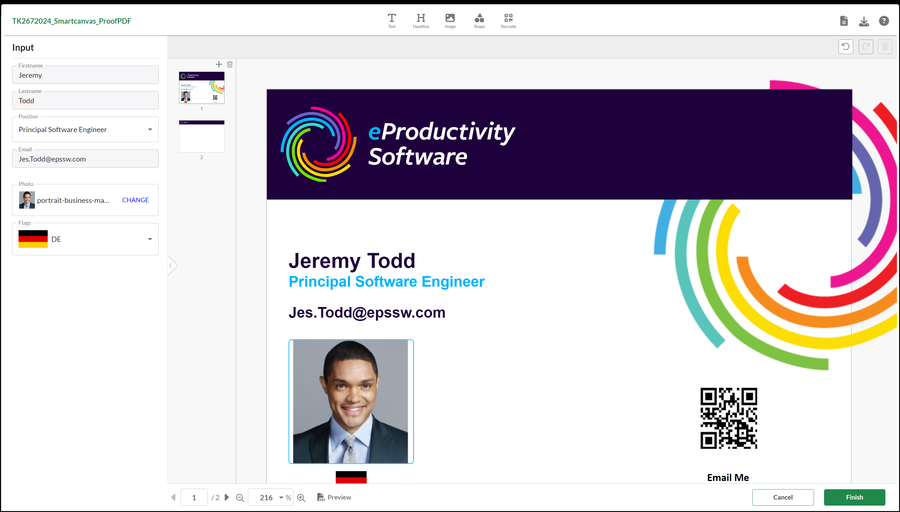 SmartCanvas is used to design products which can be customized such as Greeting Cards, Invitations, Business Cards, Calendars, Brochures, Promotional Flyers, or Soft Signage that you design using its visual editor as part of the Store's product personalization options. Depending on the product you select, you can input information to personalize a product and edit the design by adding objects such as text, images, QR codes and shapes: