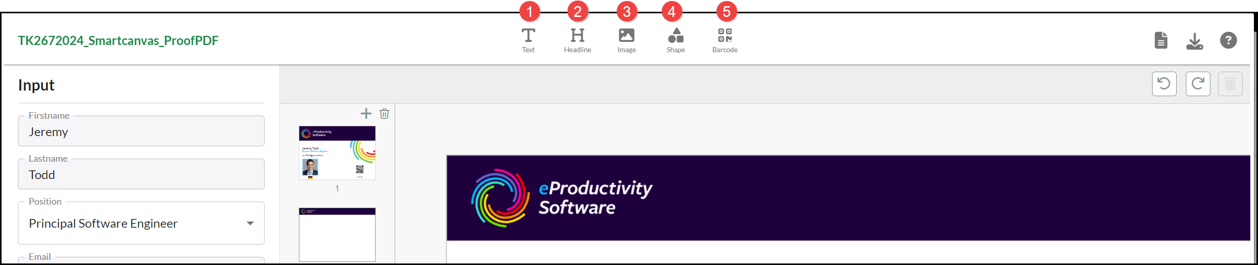 - Barcodes. Version 15.2 and below of SmartCanvas only provides the option to include QR Codes as Barcode elements).