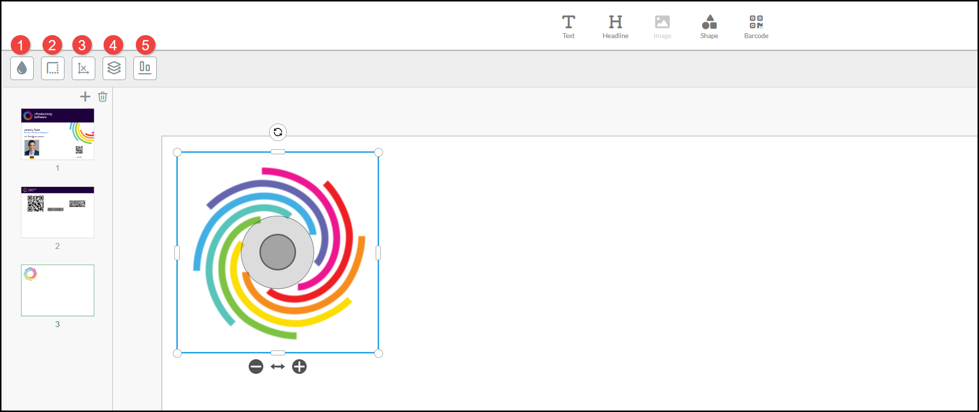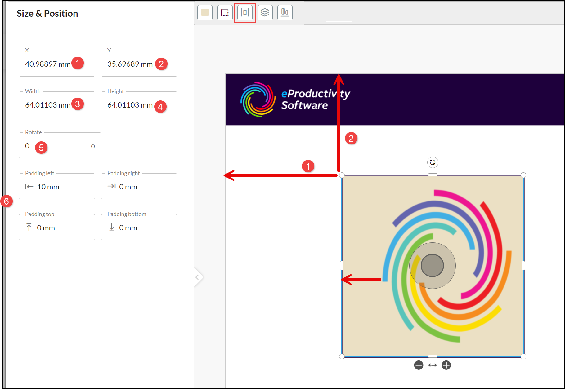 When you select Image and add a new design element, the selected Image is positioned in the top left of the selected page. Click in the outer ring of the Image and drag it to the location on the product page where you want to position it. A set of Image Tools are displayed above the canvas: