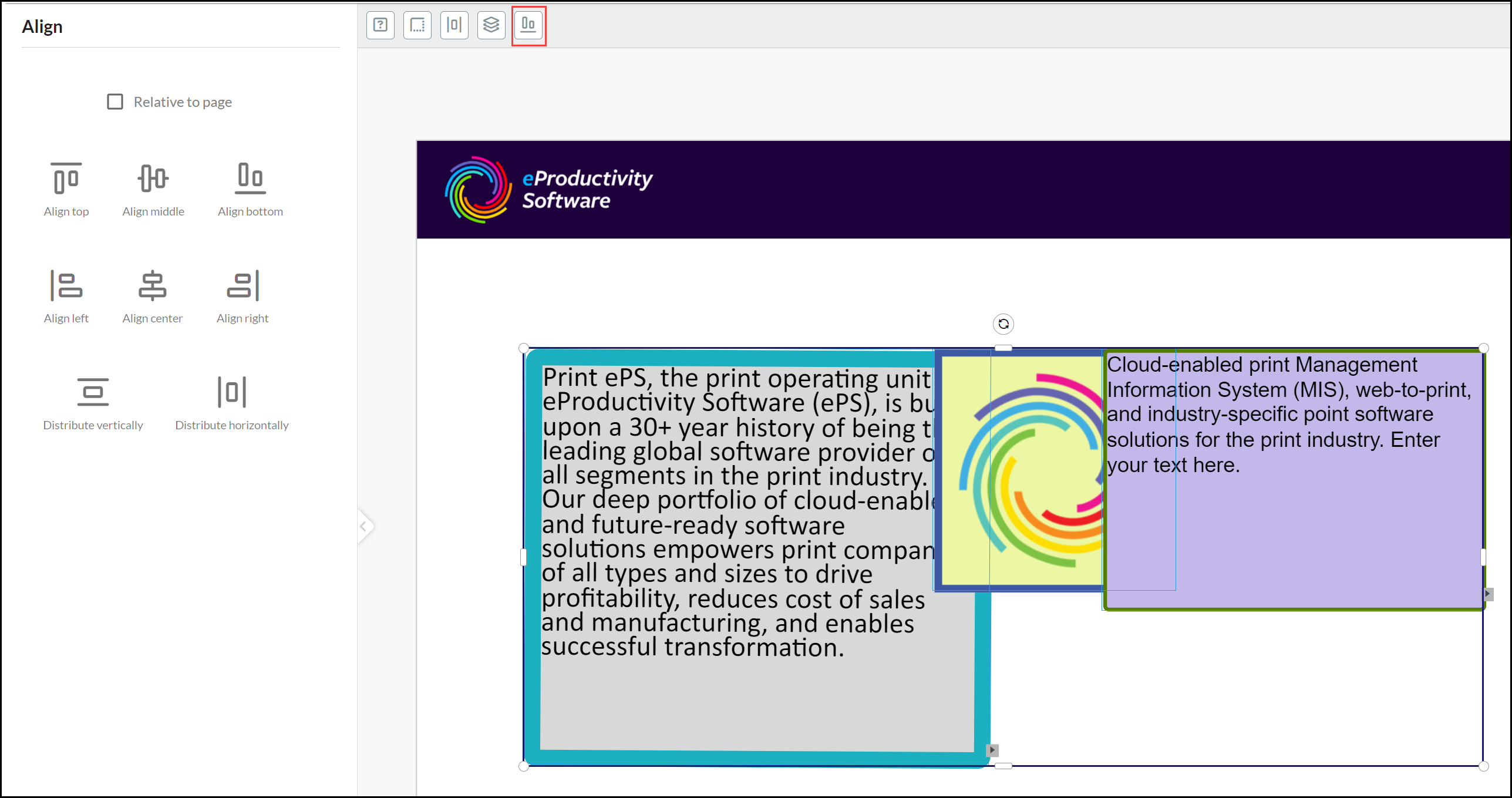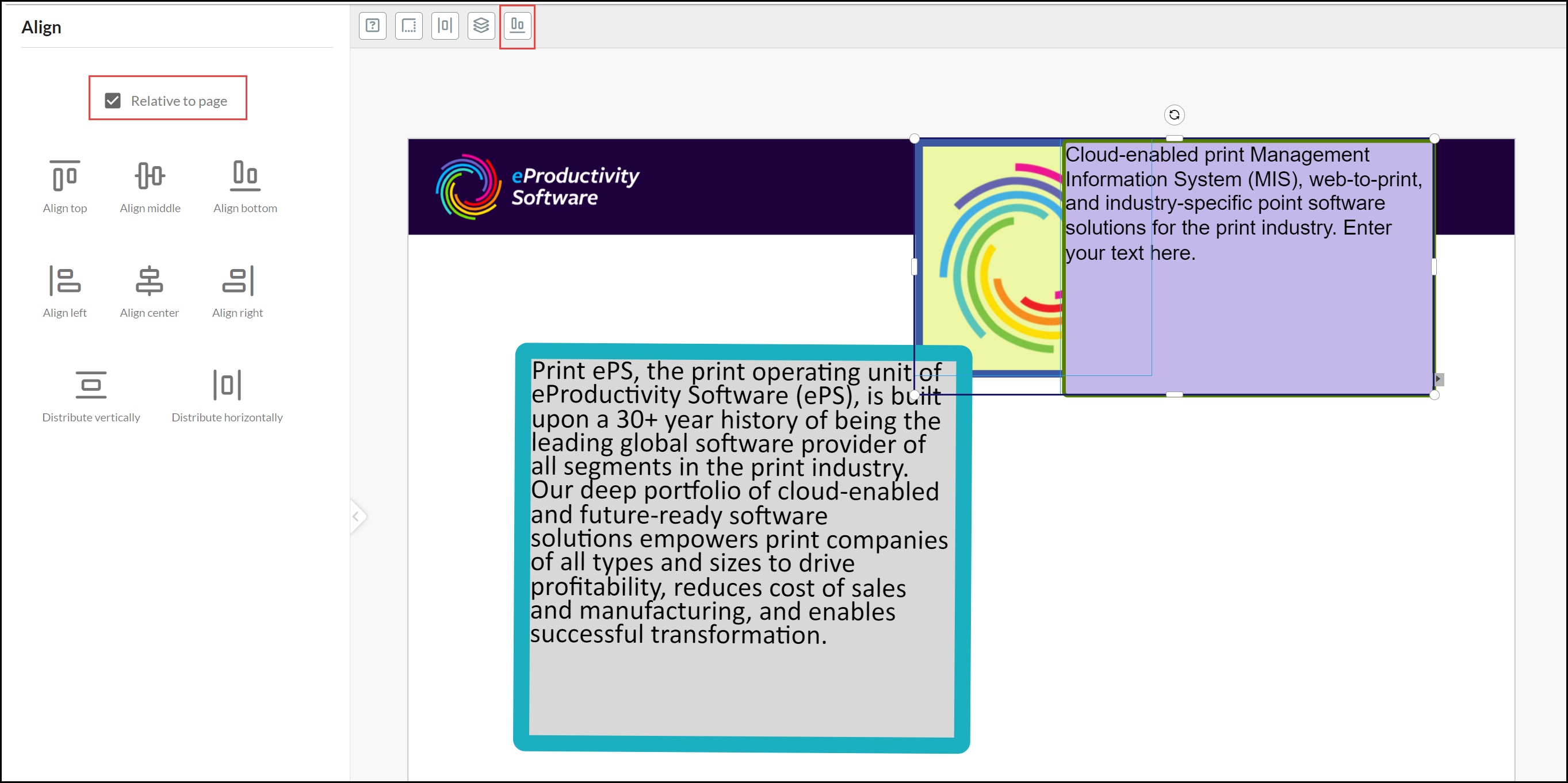 Hold down the SHIFT key and select an Image element and at least one additional element. Select the Alignment Tool. Tick Relative to page if you want to align the elements according to relevant page edge rather than each other: