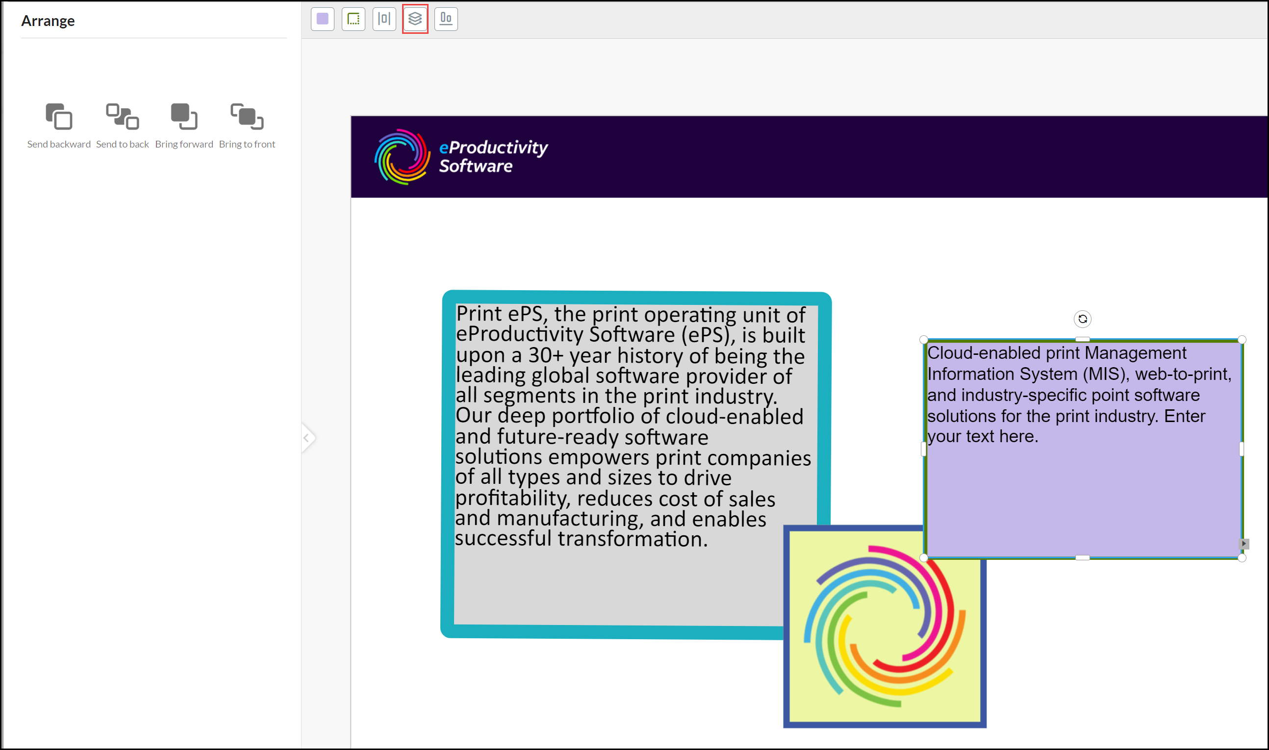 Select an Image and choose the Arrange Tool. Choose an option to move it in relation to other overlapping elements: