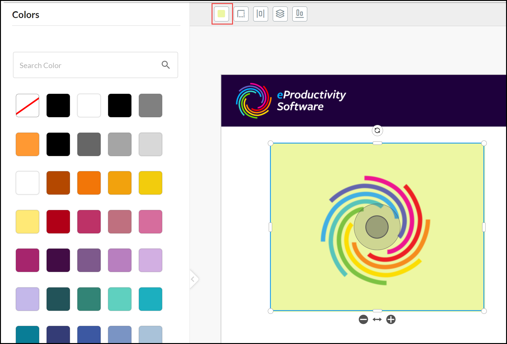 You can select and apply a Color from the Change background color palette. The background color is applied to the image (inside the Border frame and displayed in the Image tool when the image is selected):