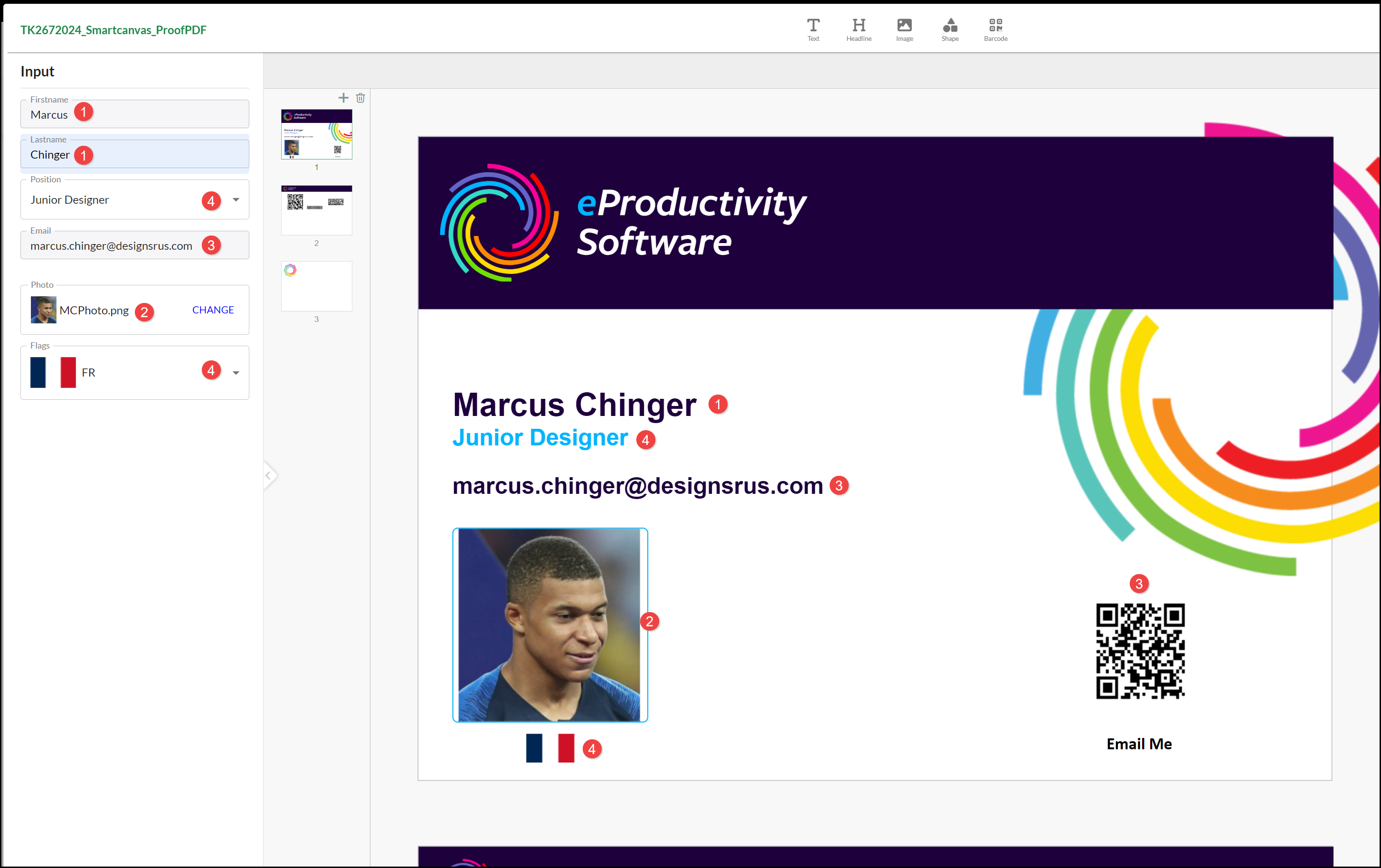 - Barcodes: QR Codes can be displayed and updated when webpage, email addresses or social media references are entered to provide quick links when scanned by a device's camera. Different types of Barcode can be used, for example, for product labels or mail franking.