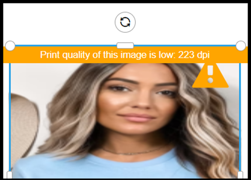 If you upload and use an image that has a low resolution it impacts the print quality, a Warning (exclamation mark) is displayed on the image, select the image on the canvas to view more details about the warning: