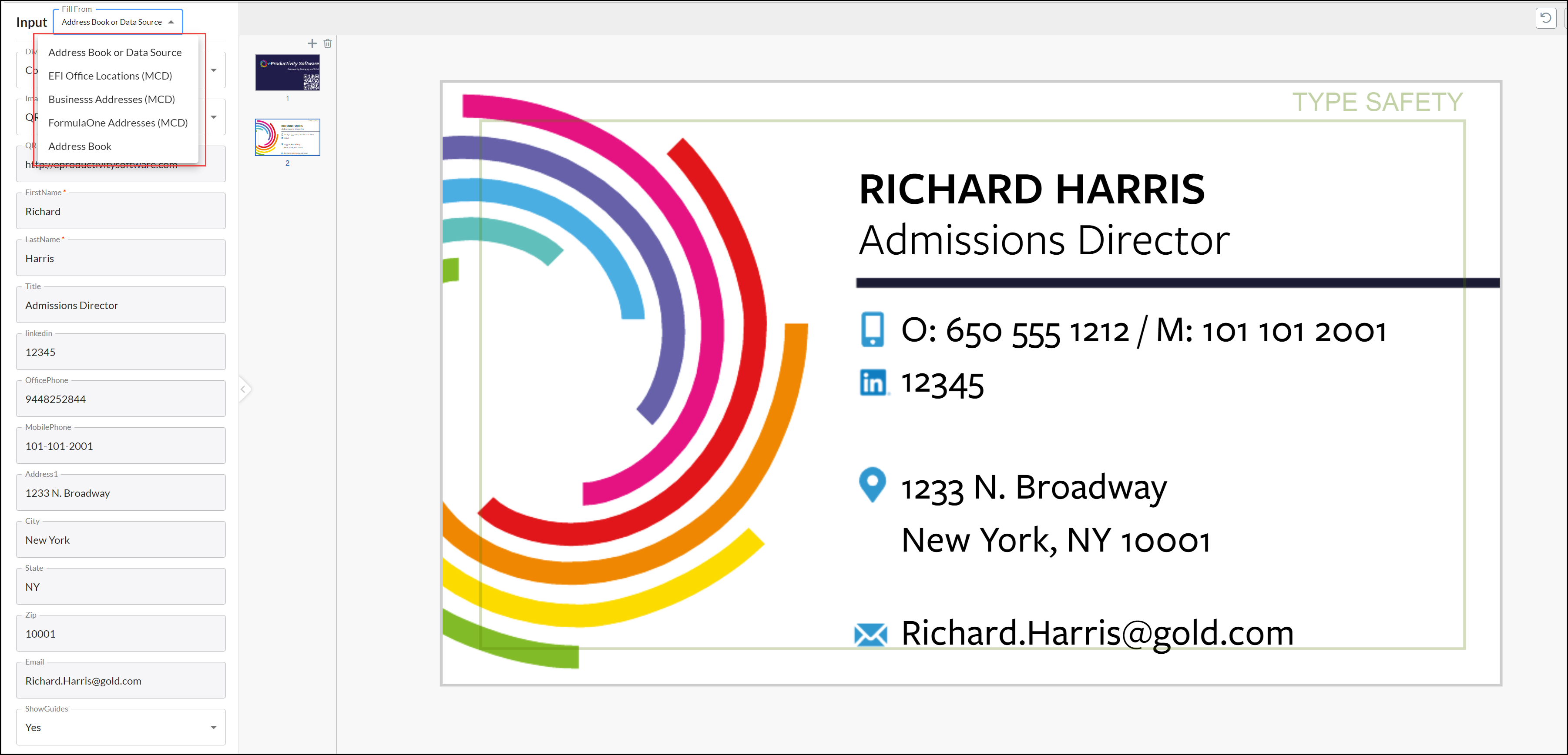 The personalization you can make to a product vary depending on the type of product and design. Some aspects may be fixed, such as elements included as part of the overall design layout. The elements you can personalize are displayed as Input form fields. Changes are displayed in the page/sheet panel as you make them: