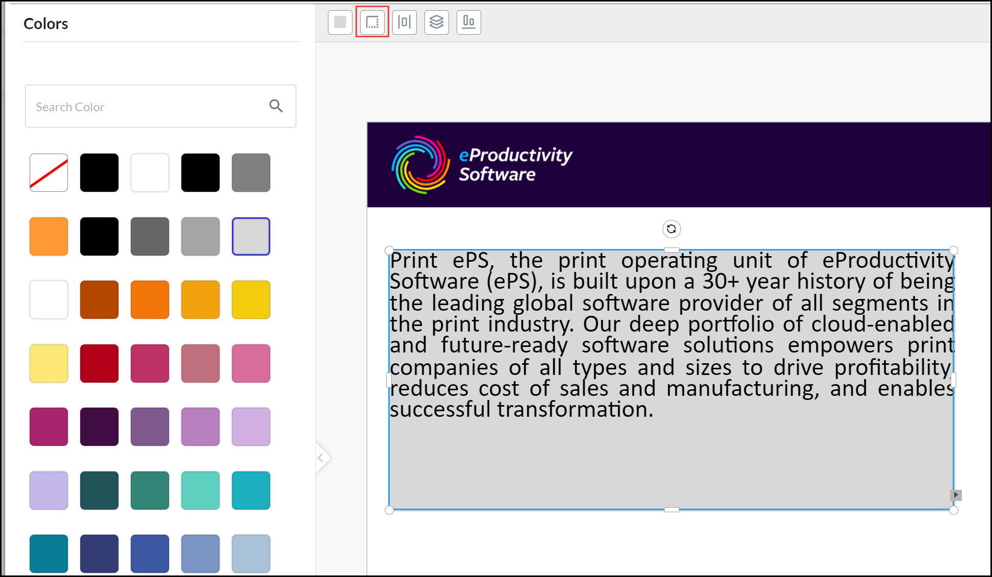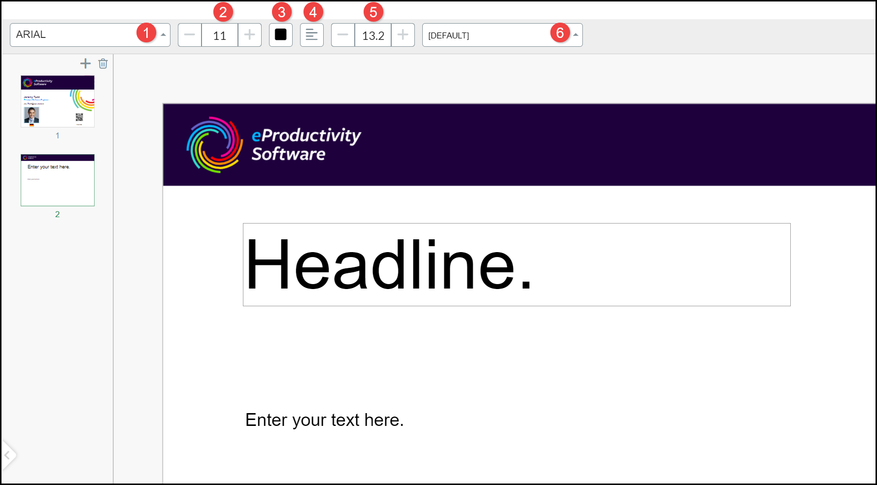 When you select Text or Headline to add a new design element, a Text Box is positioned in the top left of the selected page. Click in the center of the box and drag it to the location on the product canvas where you want it to be positioned. Text and Headline design elements have the same options available, except different paragraph styles can be created as options for Text and Headline elements. A set of Text Tools are displayed above the canvas:
