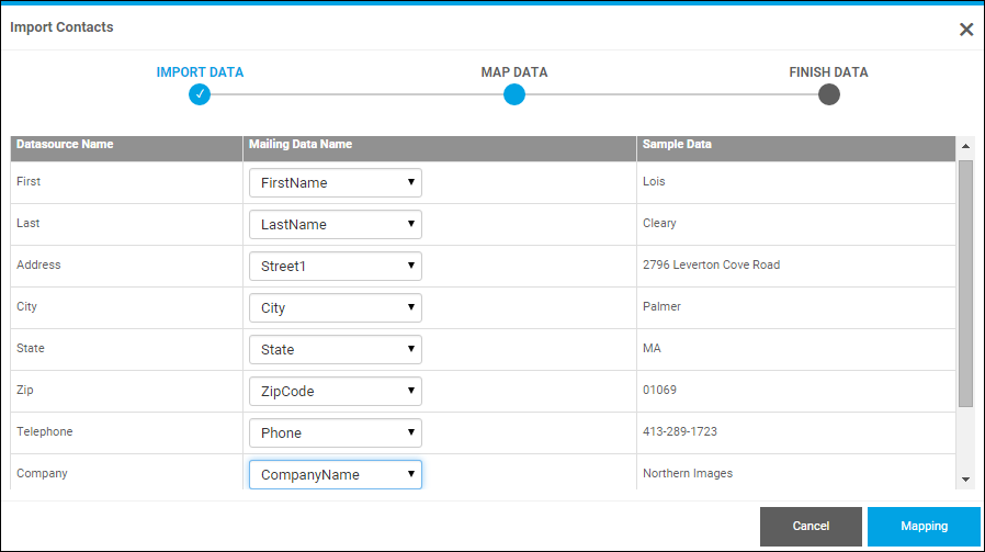 7.        After you click Import, map fields in your contact list to fields (name, address, city, and so on) that are required for mailing any printed materials that are part of the CMM campaign. The Datasource Name column lists the names of the fields in your contact list; the Mailing Data Name column lists the names of the fields required to mail printed materials. Select the correct matching fields in the Mailing Data Name column. (Some fields may be matched automatically if their names are similar.)
